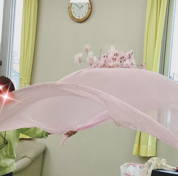 桜色の布に桜の花(造花ですが)を乗せて、